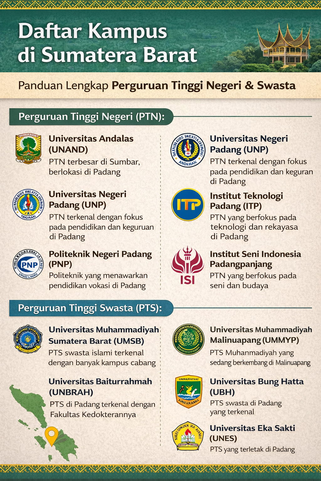 Jika Anda sedang mencari kampus di Sumatera Barat, gunakan panduan ini sebagai referensi awal untuk menentukan pilihan terbaik sesuai kebutuhan dan cita-cita Anda.